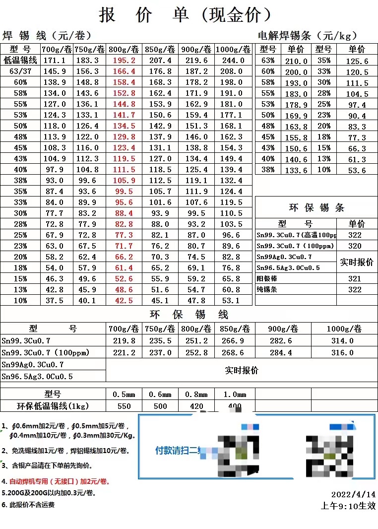 2022-04-18无铅锡丝无铅锡线报价单